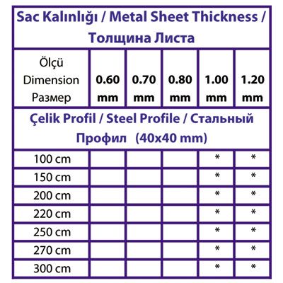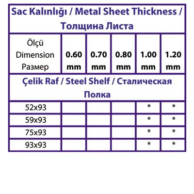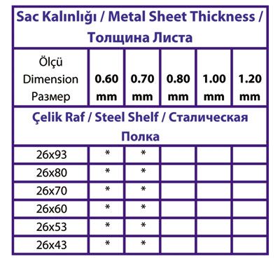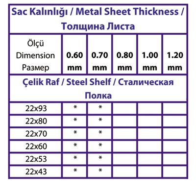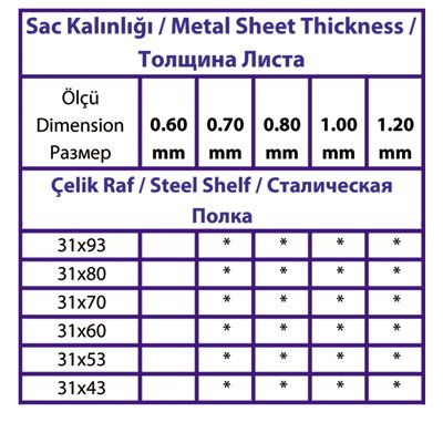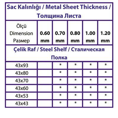 İsteğe göre farklı renk seçenekleri olmakla birlikte piyasada ve stoklarda standart olarak çelik raf ihtiyacı karşılanırken alan, yükseklik, ürün ağırlığı ve ebatları göz önünde bulundurularak karar verilir. Bu etkenler ile Profil yüksekliği ve profil kalınlığı, raf aralığı, raf sayısı ve raf kalınlığı belirlenerek minimum maliyetlerle, maksimum verimlilik sağlanır.
