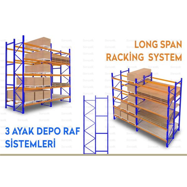 3 Ayak Depo Raf Sistemleri, sırt sırta depo raf sistemlerinin bir başka uygulamasıdır. Arka arkaya 2 palet derinliğin de yükleme yapılmakta olup. bu şekilde daha az koridor kullanılarak aynı alanda daha fazla depolama kapasitesi sağlanır.